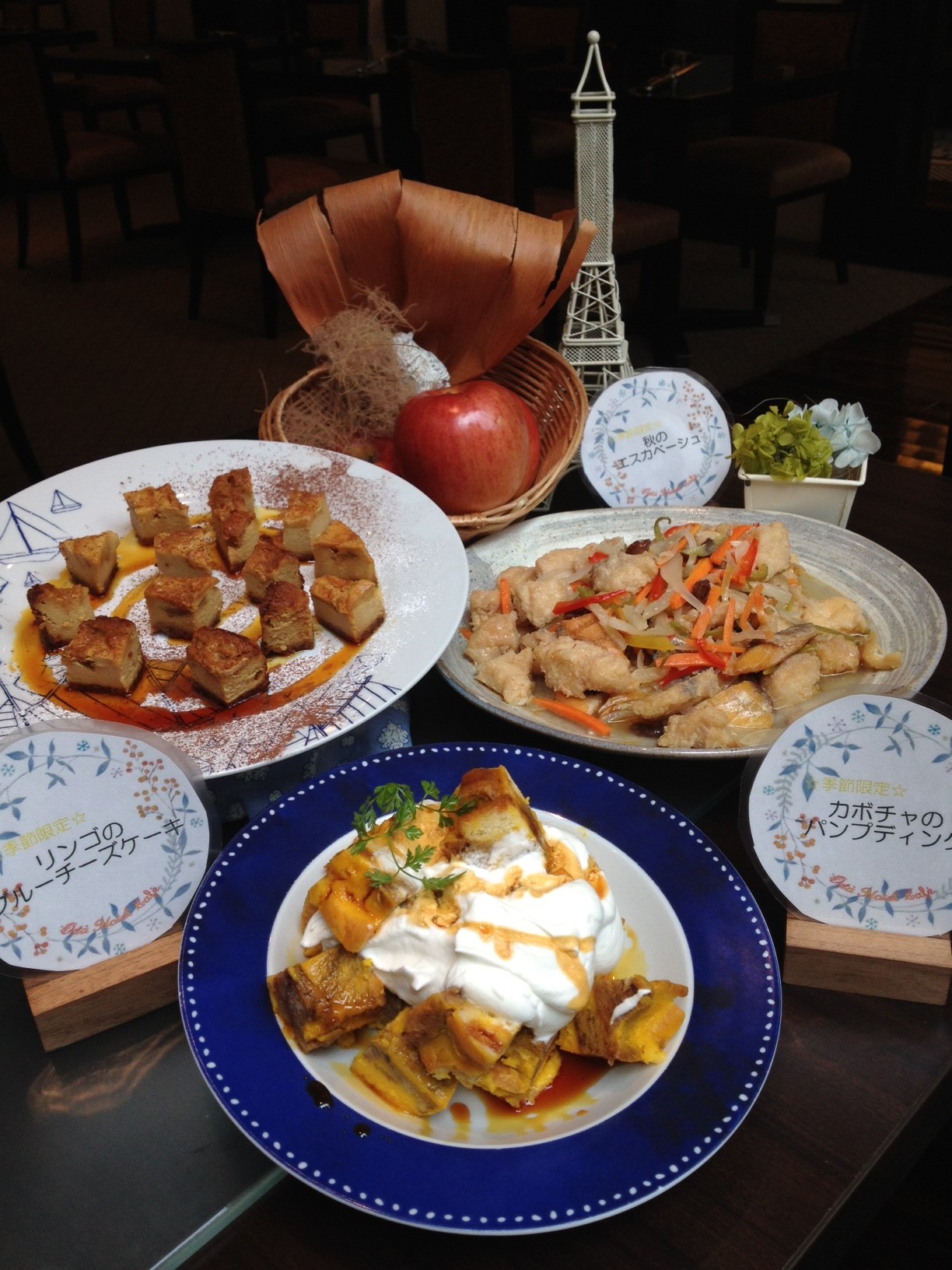 ☆ 〜秋のエスカベーシュ〜 さっぱりとした梨とレーズンがポイント ☆ 〜カボチャのパンプディング〜 人気のパンプディングをカボチャで秋らしく ☆ 〜リンゴとゴルゴンゾーラのチーズケーキ〜 甘さ控えめで大人の味
