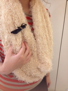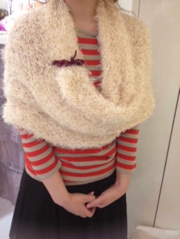 こちらのスヌードは編み目が大きいので、ショールピンだけでなく、