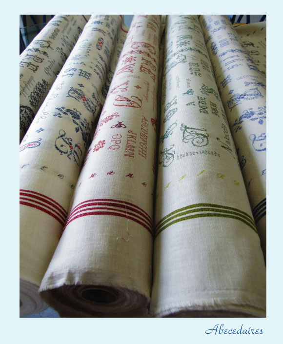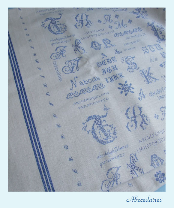 アベセデー(ABCD)とは、基本ステッチを組み合わせて、数字やアルファベットなどを刺繍した見本のこと。アベセデーは20世紀初頭まで、フランスでは女学校の必修科目でした。フランスでは古くから家族それぞれの持ち物にイニシャルを刺繍する習慣があったため、機械刺繍が普及するまではアベセデーがよく作られていたそうです。結婚式できる衣装や新婚生活で使う寝具をすべて自分で縫うという習慣が根付いている地方もあり、イニシャルを刺繍することは、当時の女性にとっていかに大切な技術だったかがわかります。
