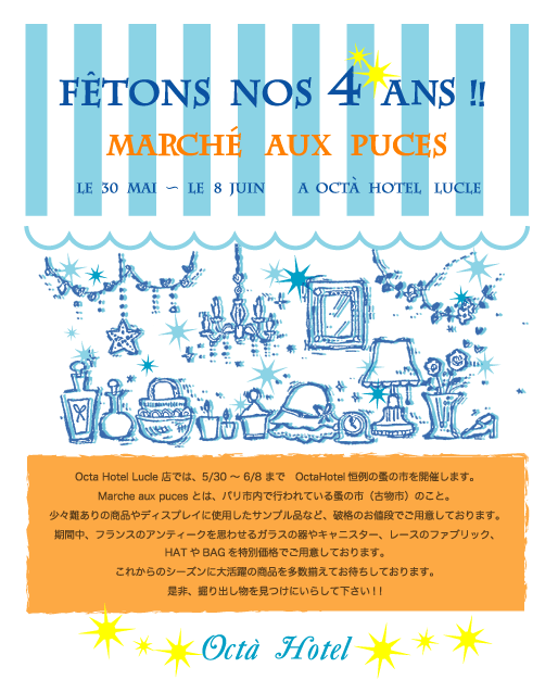 OctaHotelLucle店では、5月30日~6月8日まで4周年を記念して、蚤の市を開催いたします。