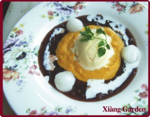 北海道産の栗カボチャを使用したクリームを囲む小豆ぜんざい。 その中心にはバニラビーンズ入りの濃厚なアイスクリーム。